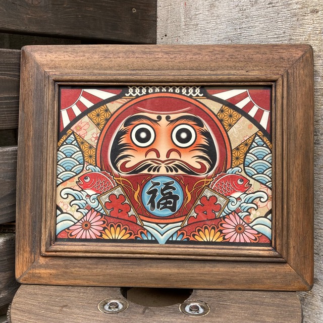 めで鯛だるま フレームはアンティークフレームを ハンドメイド加工した額縁、 年代は不明です 色は少し明るめのウォールナット 表面はガラスです 裏面は壁掛けビス ☆サイズ☆ 約 縦26.5cm 横32.0cm 厚み2.5cm ☆素材☆ アンティークフレーム 表面ガラス ワニス 水性ニス インクジェット 水彩紙 bbqcomic 尾九の作品はオリジナルデザイン 実物の方 紙の質感など とても良い作品です 贈り物やプレゼントにも喜ばれます ☆☆こちらのフレームは 1点物のハンドメイドとご理解の程 よろしくお願い致します☆☆ ☆ご注意☆ 当方は全てオリジナルのデザインで制作しておりますので 許可なく画像などの使用 アレンジ制作、2次販売、転載は固く禁止を致します Unauthorized copying and replication of the contents of this site,