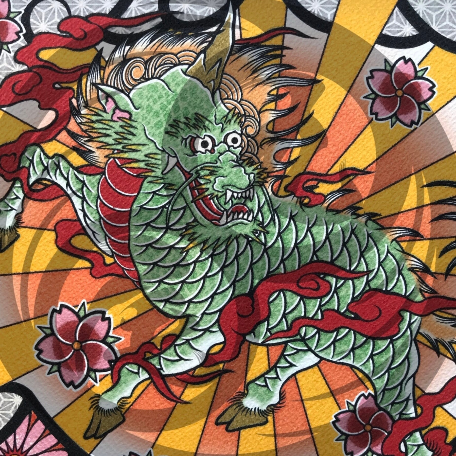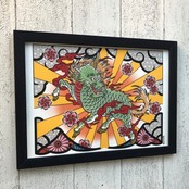 尾九 開運イラスト 幸運を呼ぶ 麒麟 緑 A4サイズ フレーム付き