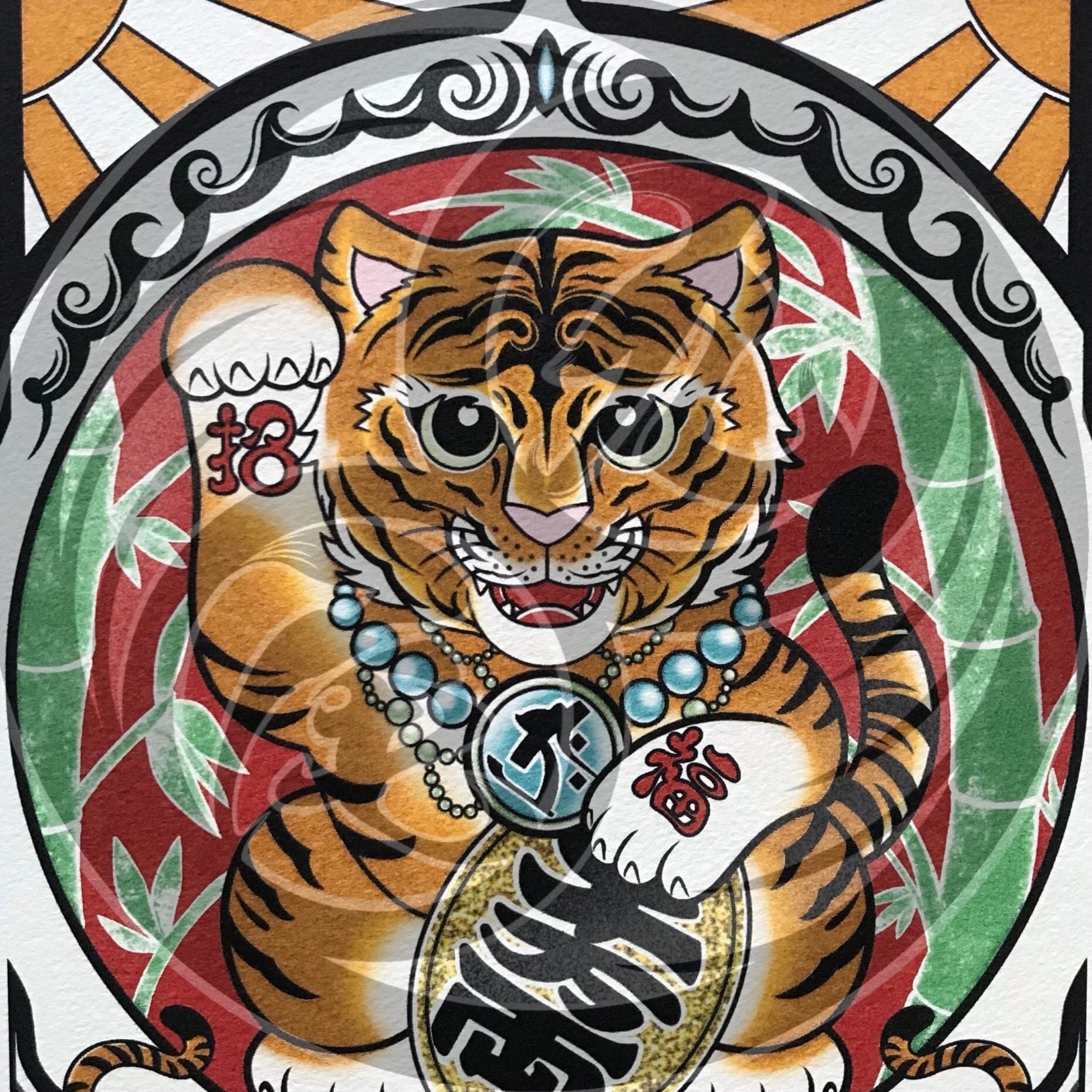 尾九 開運イラスト 招き虎 寿文字 A4サイズ フレーム付き
