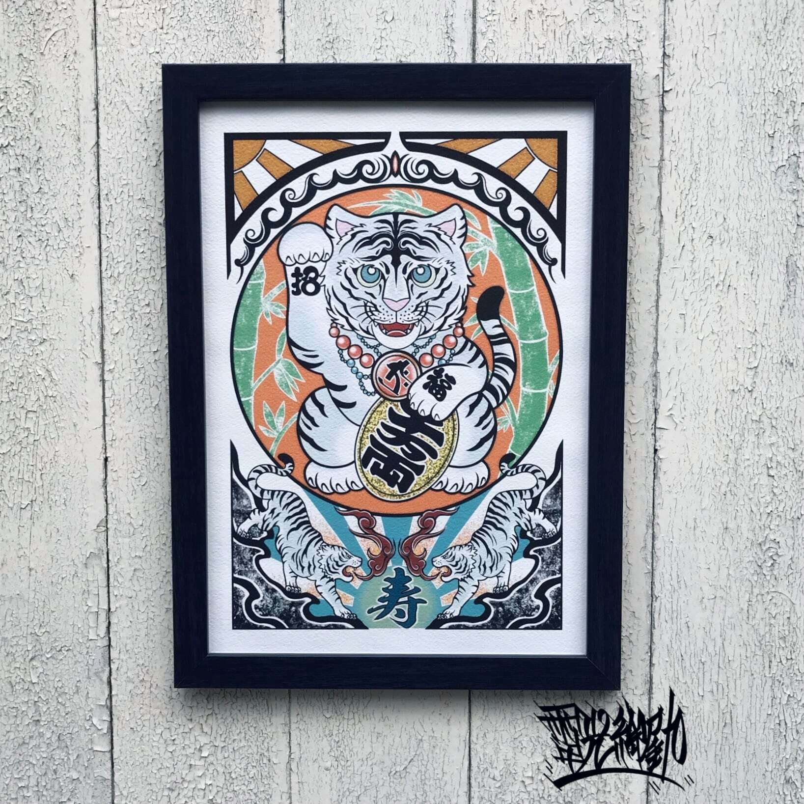 尾九 開運イラスト 招き虎 白虎 寿文字 A4サイズ フレーム付き