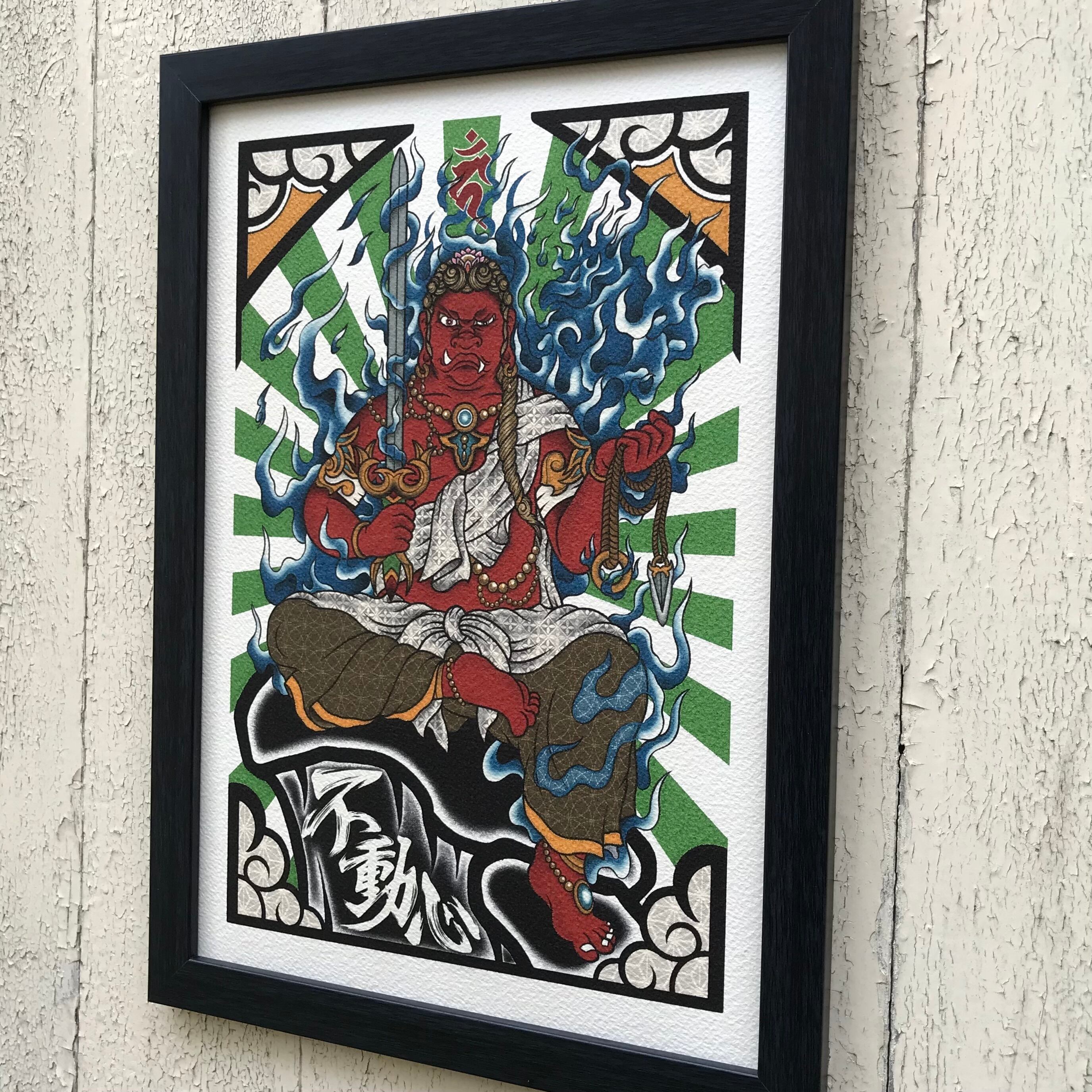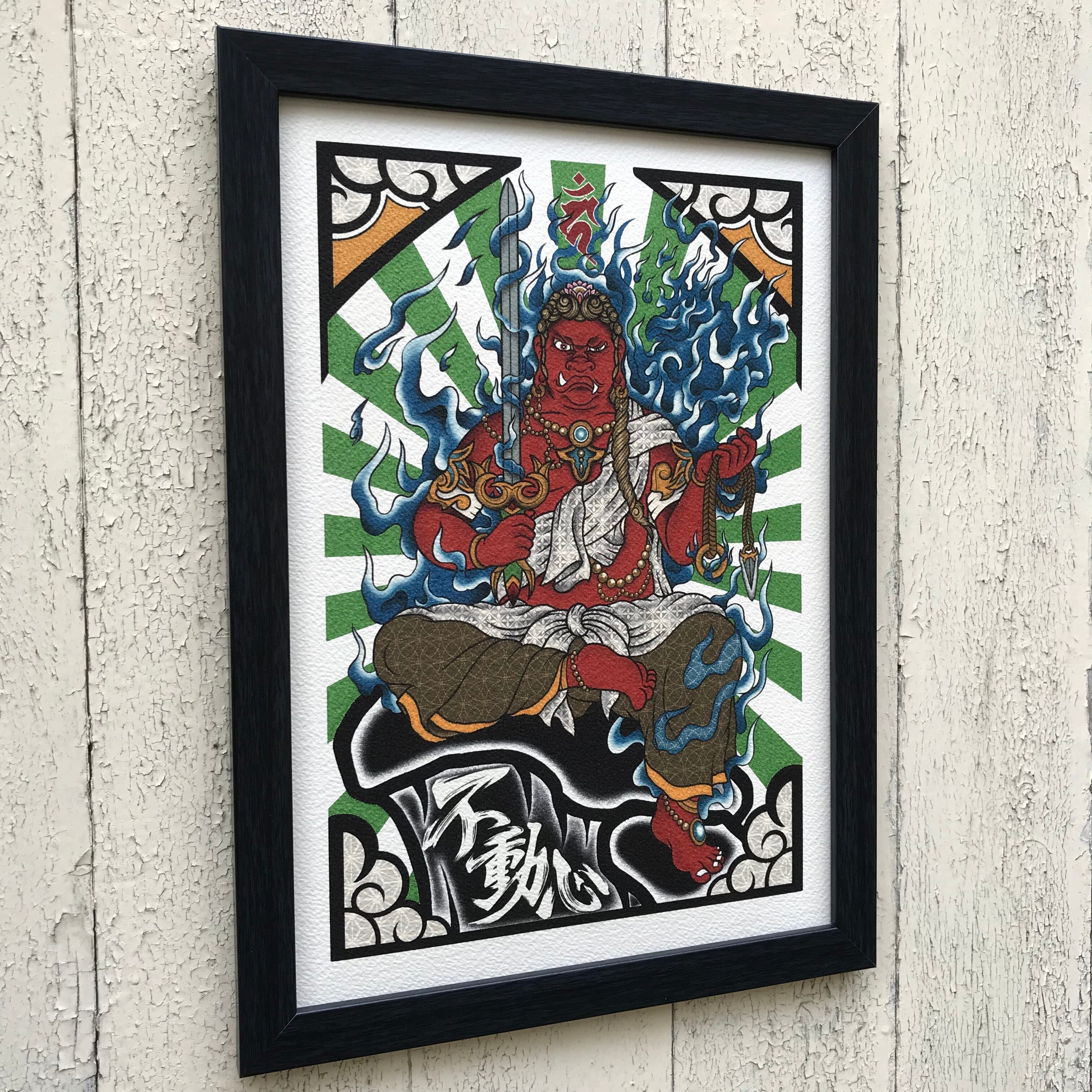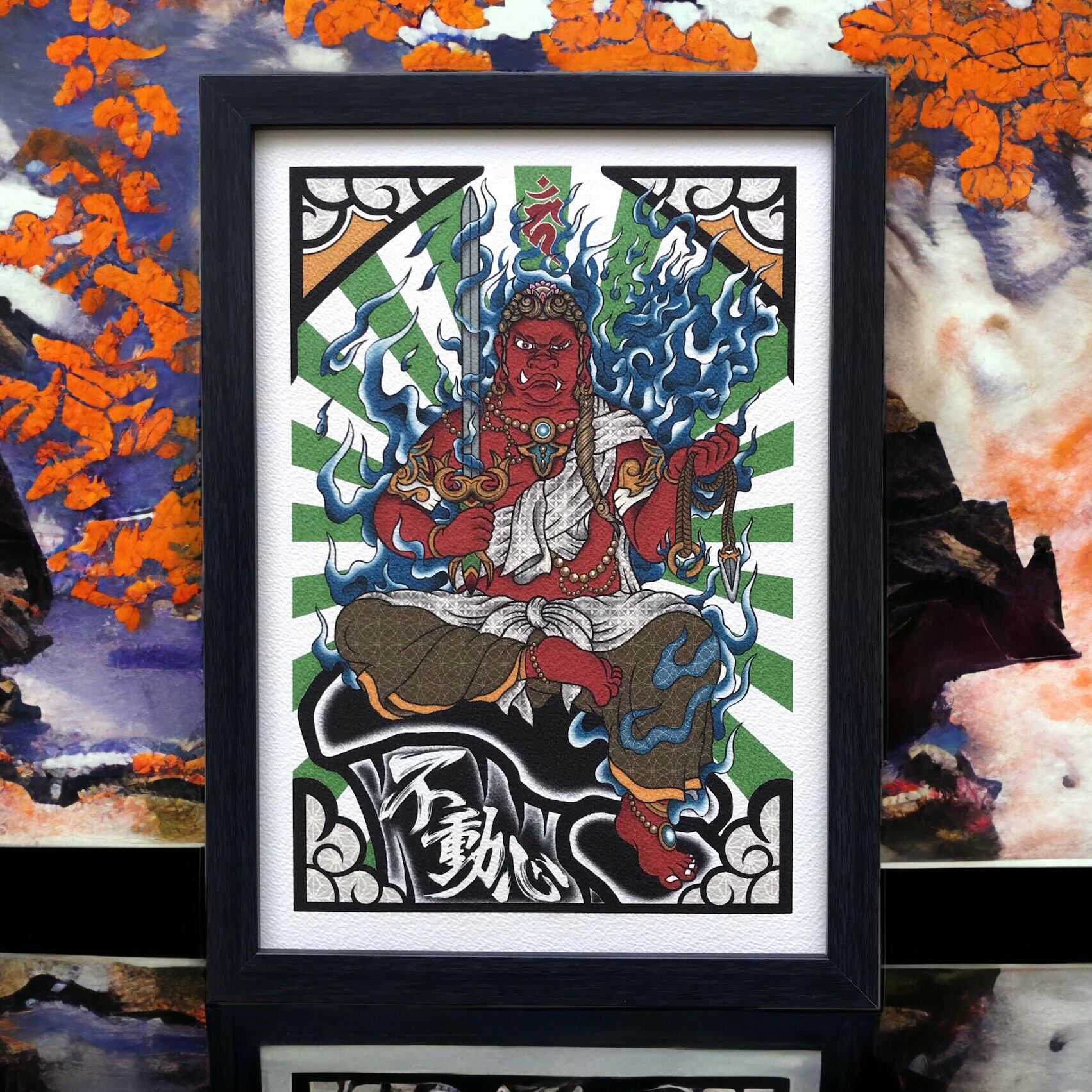 尾九 画 不動明王 赤不動 迦楼羅炎 不動心 A4サイズ フレーム付き