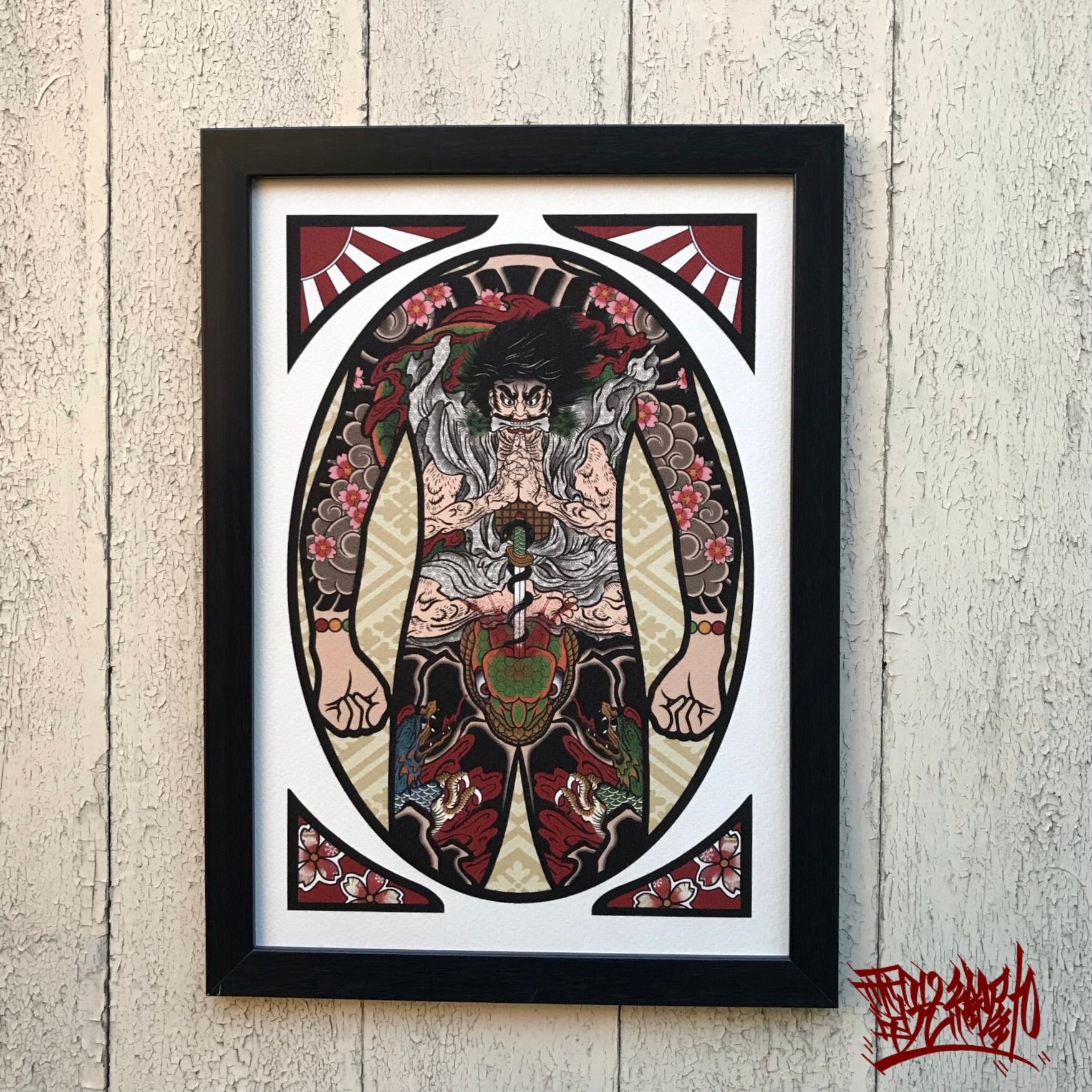 尾九 刺青画 男子背中ノ図 鬼童丸 桜吹雪 A4サイズ フレーム付き