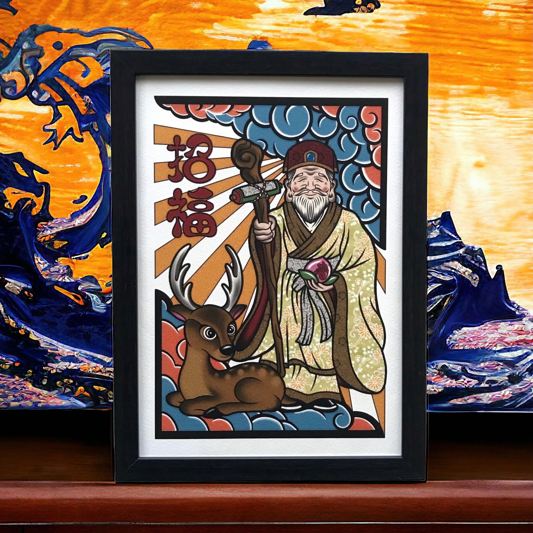 尾九 開運イラスト 七福神 寿老人 A4サイズ フレーム付き