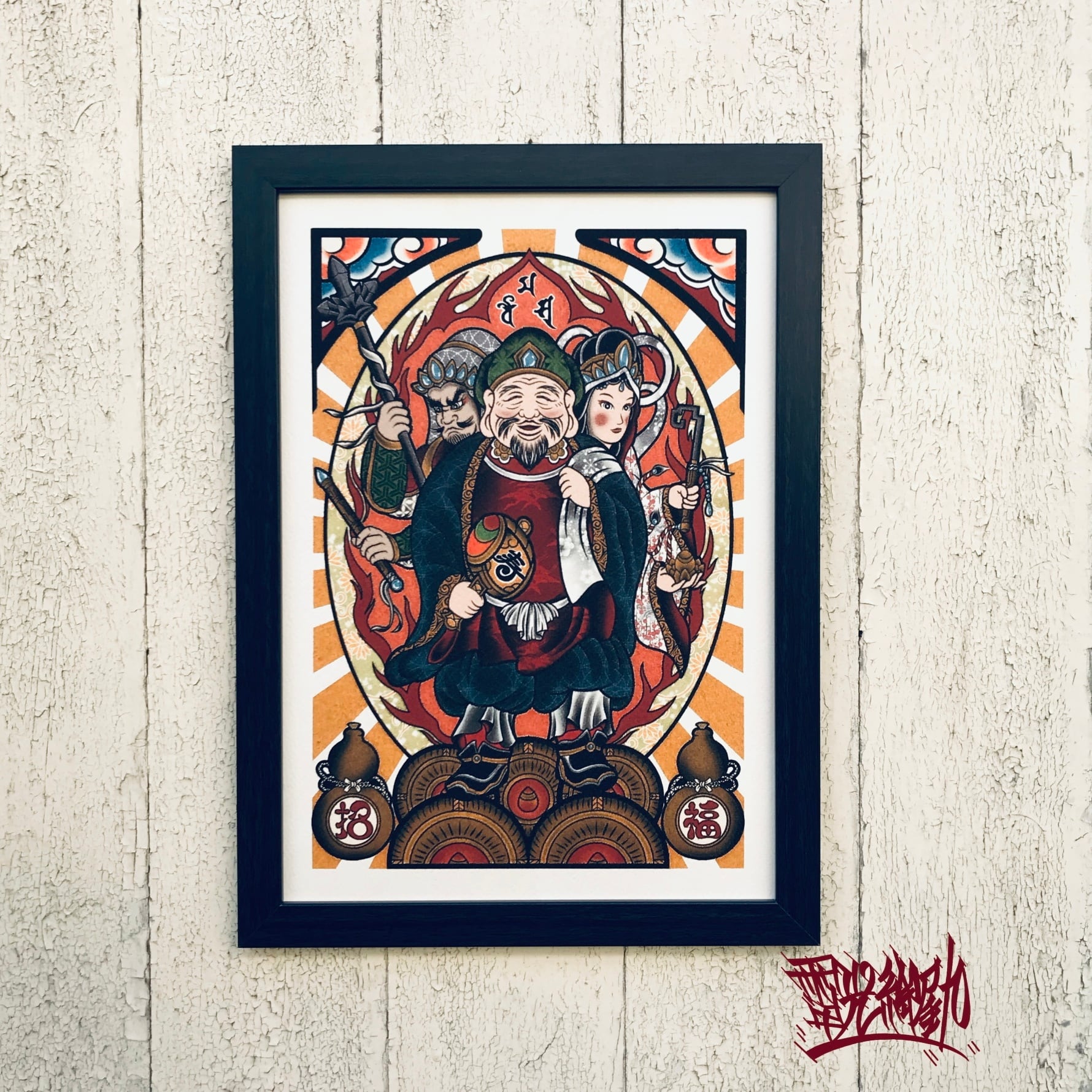 尾九 開運イラスト 三面大黒天 A4サイズ フレーム付き
