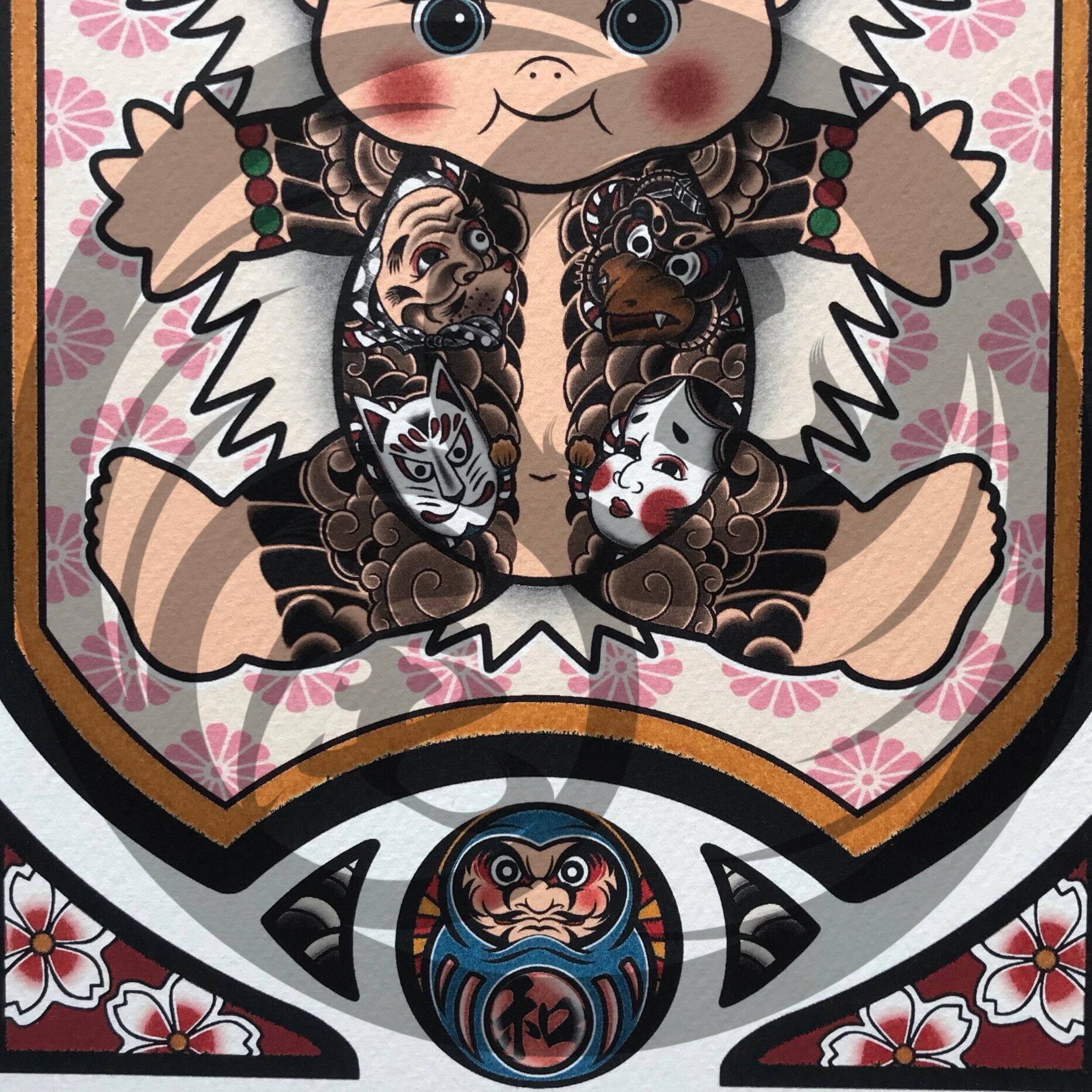 尾九 刺青画 戦国胸割りちゃん 面チラシ 青色和だるまA4サイズ フレーム付き