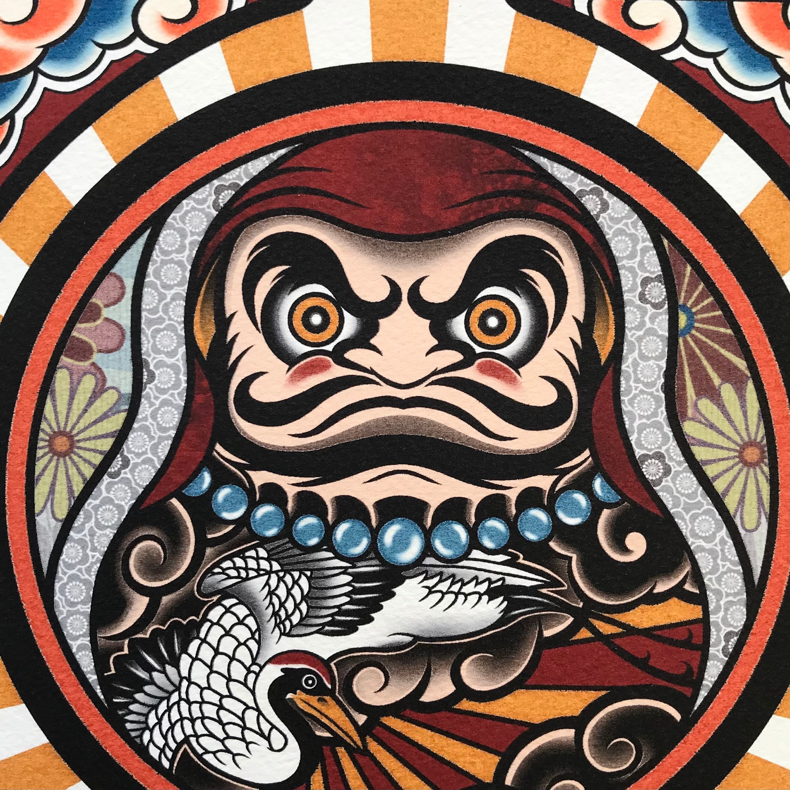尾九 画 刺青赤達磨 鶴 A4サイズ フレーム付き