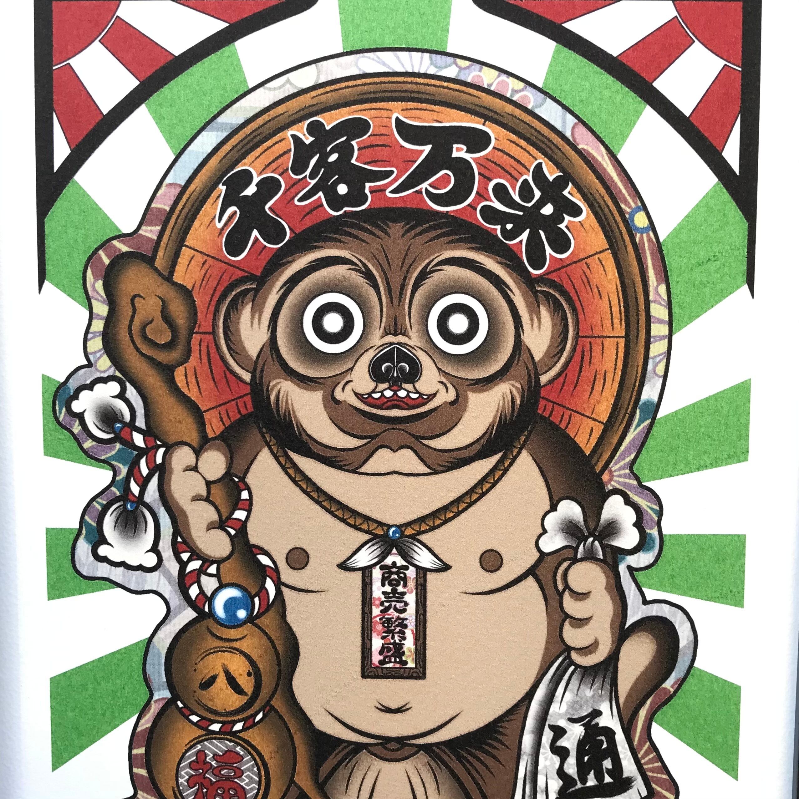 尾九 開運イラスト 福狸 千客万来 御光緑色 A4サイズ フレーム付き