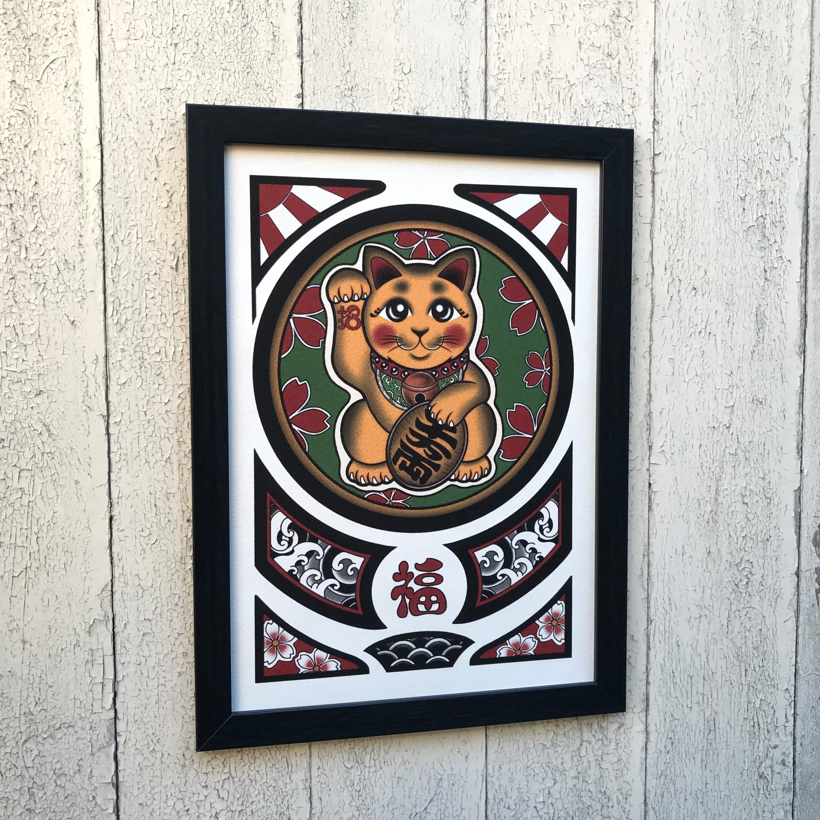 尾九 開運イラスト 招き猫 金色 A4サイズ フレーム付き