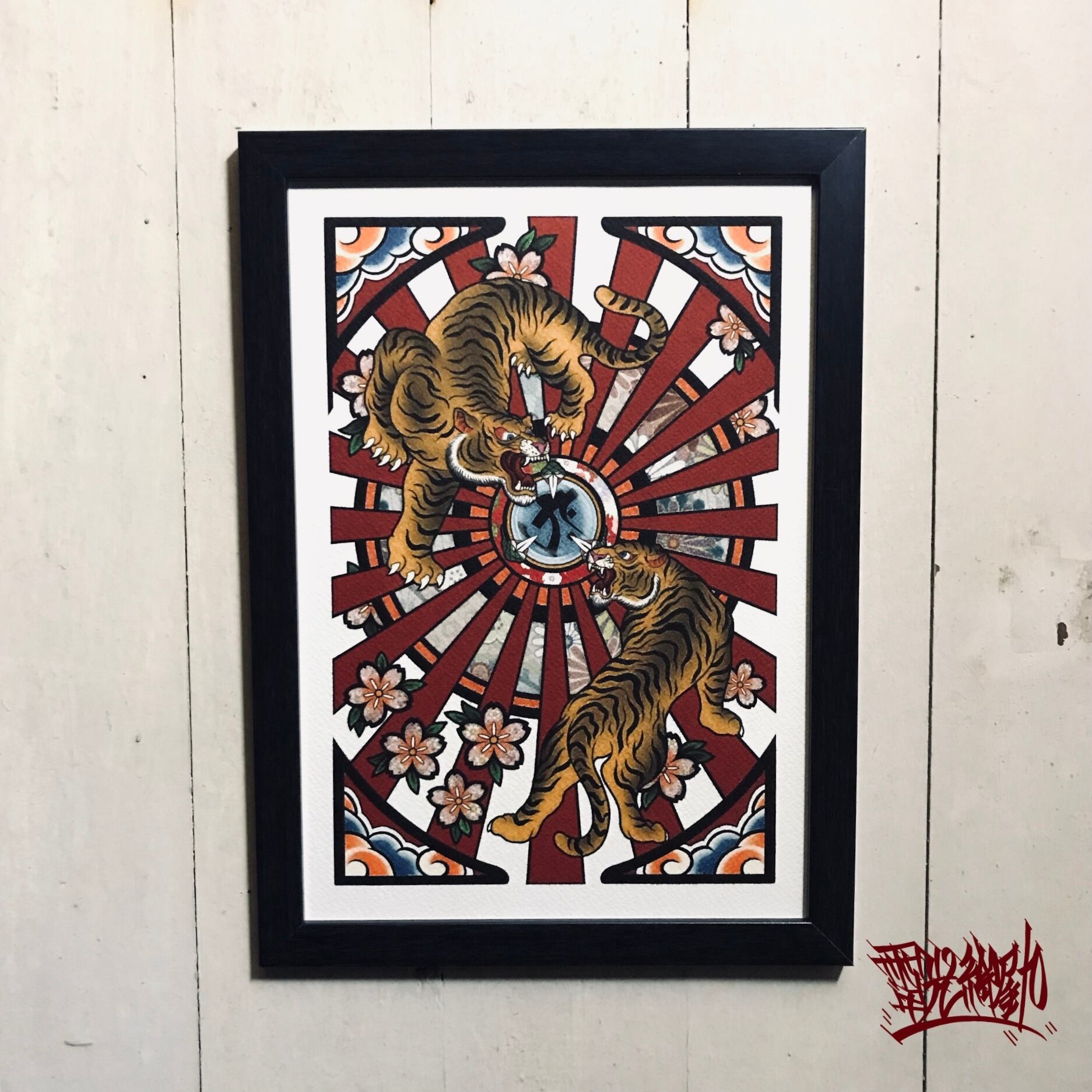 尾九 画 魔除け イラスト 虎 両虎相闘 干支 梵字 タラーク A4サイズ フレーム付き