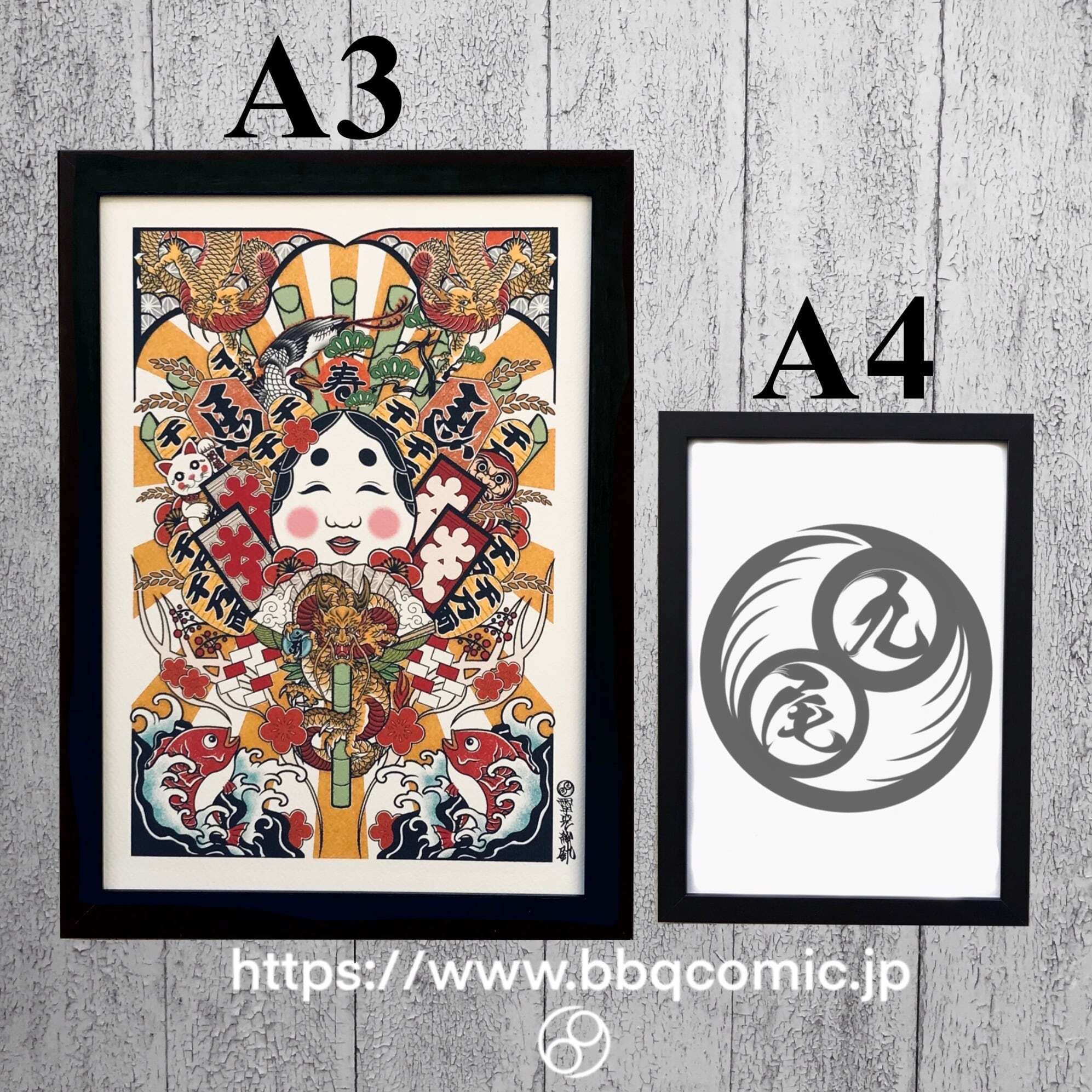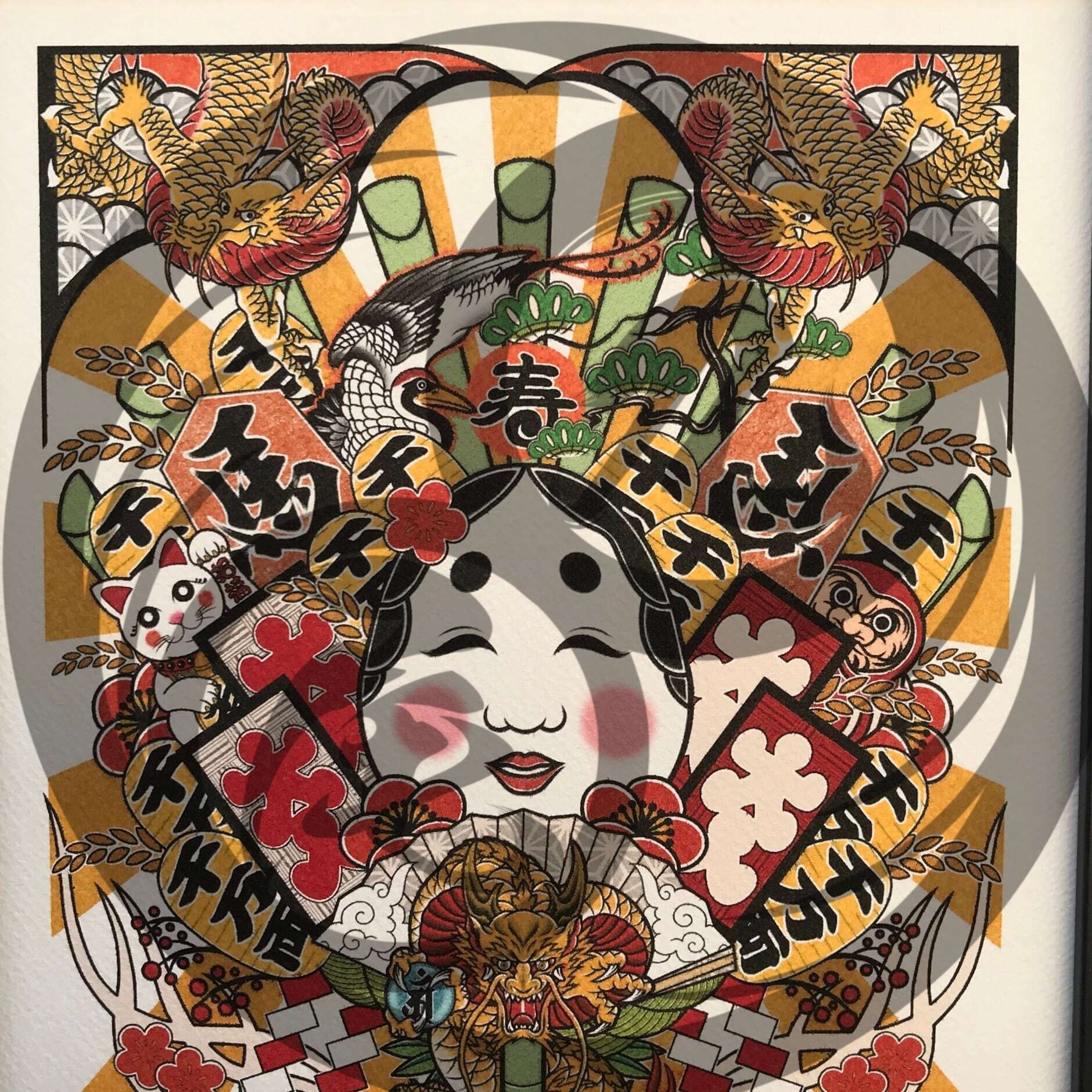 尾九 吉祥画 縁起熊手 イラスト 辰年 龍 おかめ A3サイズ フレーム付き